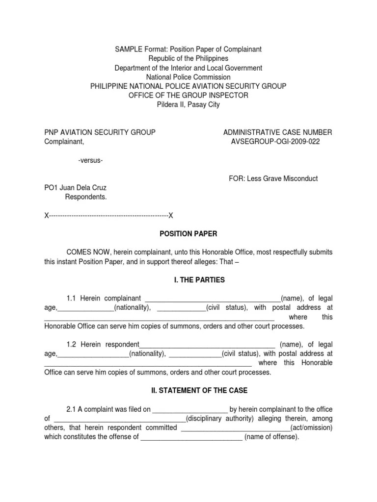 271965252 Legal Writing Position Paper For Plaintiff Docx Republic Of The Philippines National Capital Judicial Region Metropolitan Trial Court Branch Course Hero from www.coursehero.com Words are not only conveyors of information, in fact, they also present. In a position paper assignment, your charge is to choose a side on a particular topic, sometimes controversial, and build up a case for your opinion or position. A paper in which a member state or observer sets out its position on a set of topics. Position essays make a claim about something and then prove it through arguments and evidence. Each paragraph should present an idea or main concept that clarifies a portion of the position statement and is supported by evidence or facts. Prepare court documents with this legal pleading paper template when you need 28 lines per page. What are the three parts of a position paper? Most model un conferences require delegates to submit a position paper, an essay covering a country's perspective on the assigned topics of a conference.
